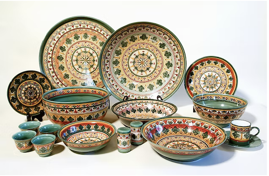 Each piece is hand painted on fine china and kiln fired by the Sisters of Bethlehem in Livingston Manor. The original patterns have been created by the Sisters of Bethlehem here and abroad.